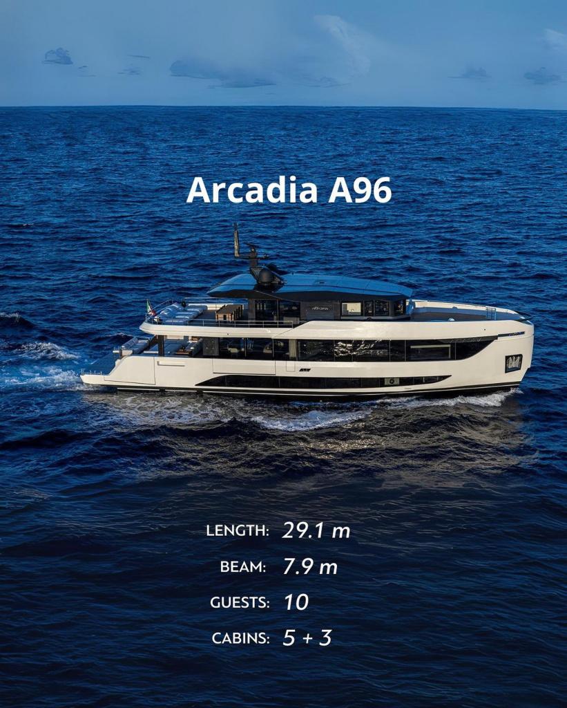 - Arcadia A96, 29,1 м — Солнечные батареи встроены в стеклянную крышу верхней палубы, что создает экологичный источник энергии и особое атмосферное освещение.