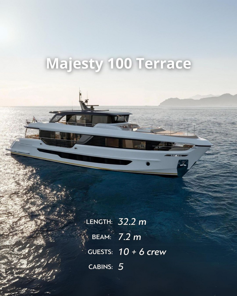 - Majesty 100 Terrace, 32,2 м — Новейшая модель Majesty Yachts, где закрытая верхняя палуба и просторная терраса создают идеальное место для приватного отдыха и наслаждения видами.