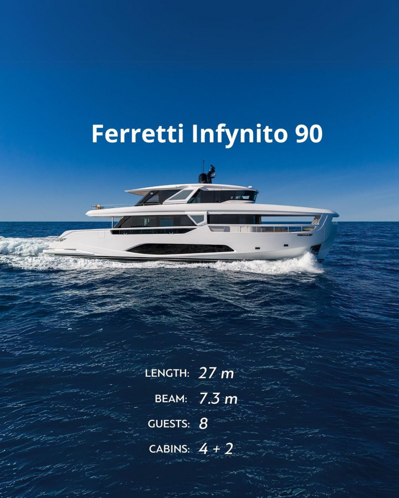 - Ferretti Infynito 90, 27 м — Помимо закрытого салона на верхней палубе, на борту также есть терраса на главной палубе для отдыха в любое время года.